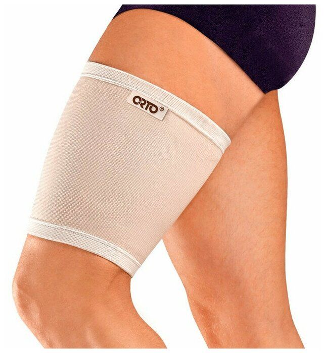 Эластичный бандаж на бедро из материала с содержанием нитей с керамическим напылением («керамик»). Имеет мягкий кант для комфортного надевания и ношения.