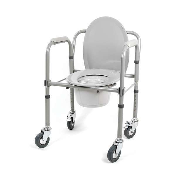 Кресло-туалет 10581CA обладает складной конструкцией на четырех колесах с тормозами. Высота сиденья регулируется. Все элементы (съемное ведро, крышка и поручни) изготовлены из гигиенического пластика. Максимальная нагрузка, которую выдерживает изделие, 115 кг.
