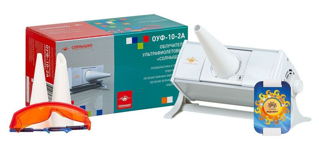 Ультрафиолетовый облучатель ОУФ-10-2А «Солнышко» (кварцевая лампа Солнышко) предназначен для местного (локального) и внутриполостного облучения в эффективном спектральном диапазоне излучения 230-400 нм при инфекционных, инфекционно-аллергических, воспалительных, посттравматических заболеваниях и повреждениях в лечебных и лечебно-профилактических учреждениях (стационарах, поликлиниках, санаториях, профилакториях и др.), а также в домашних условиях.