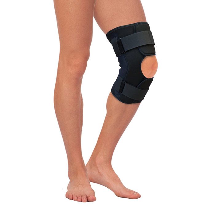 разъемная конструкция коленного бандажа позволяет максимально эффективно зафиксировать коленный сустав и надколенник при ограниченной подвижности сустава, отеке сустава и при повышенной массе тела снабжен двумя металлическими шарнирами, обеспечивающими правильную биомеханику коленного сустава.