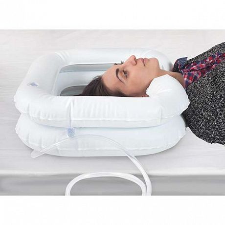 Надувной подголовник для мытья головы, снабженный сливом. Помыть голову с такой ванной легко и удобно даже на кровати. После использования ванночка сдувается и занимает минимум места.